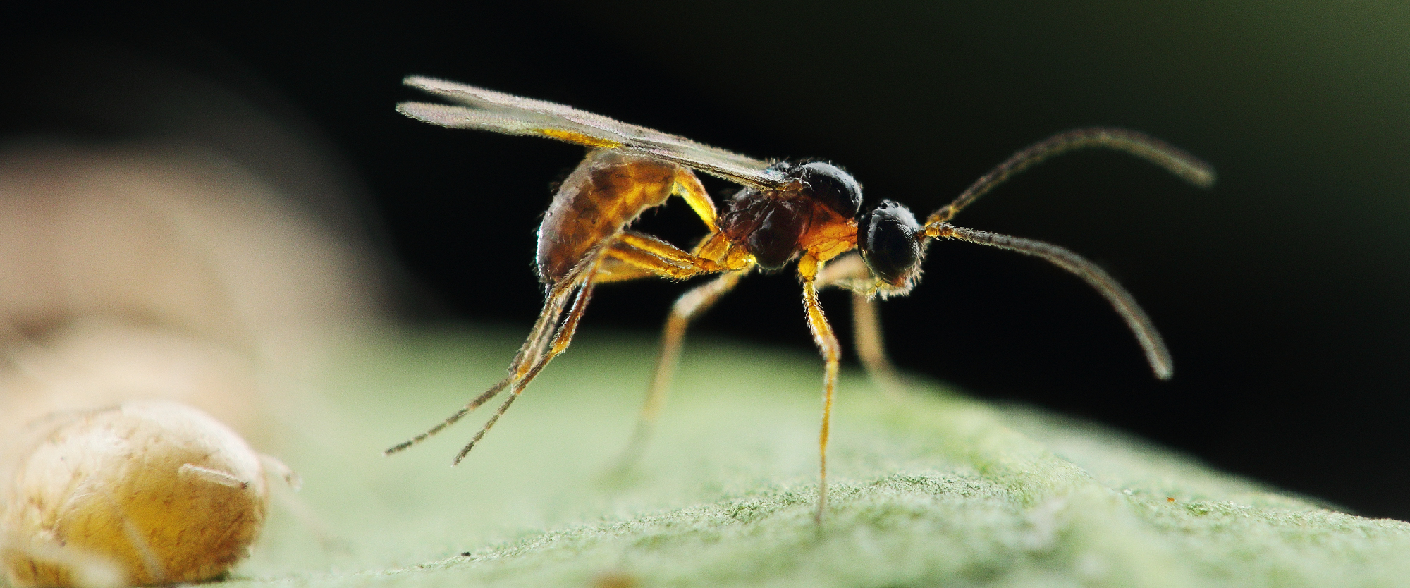 The adults are small slender wasps with black, brown and yellow coloration, brown legs and long antennae. The female inserts a single egg in the host aphid, which develops whilst consuming the internal tissues of the host. BioMartricariae’s size depends on the size of the parasitized aphid, but is usually about 2-4 mm long. Aphidius matricariae’s activity is optimal between temperatures of 59°F-82°F (15-28°C). This species is not strongly affected by short-day induced diapause, so it can be used all year long. A complete life cycle takes about 10 days at 77°F (25°C) and under optimal conditions female wasps may parasitize 100 or more aphids in her lifetime.